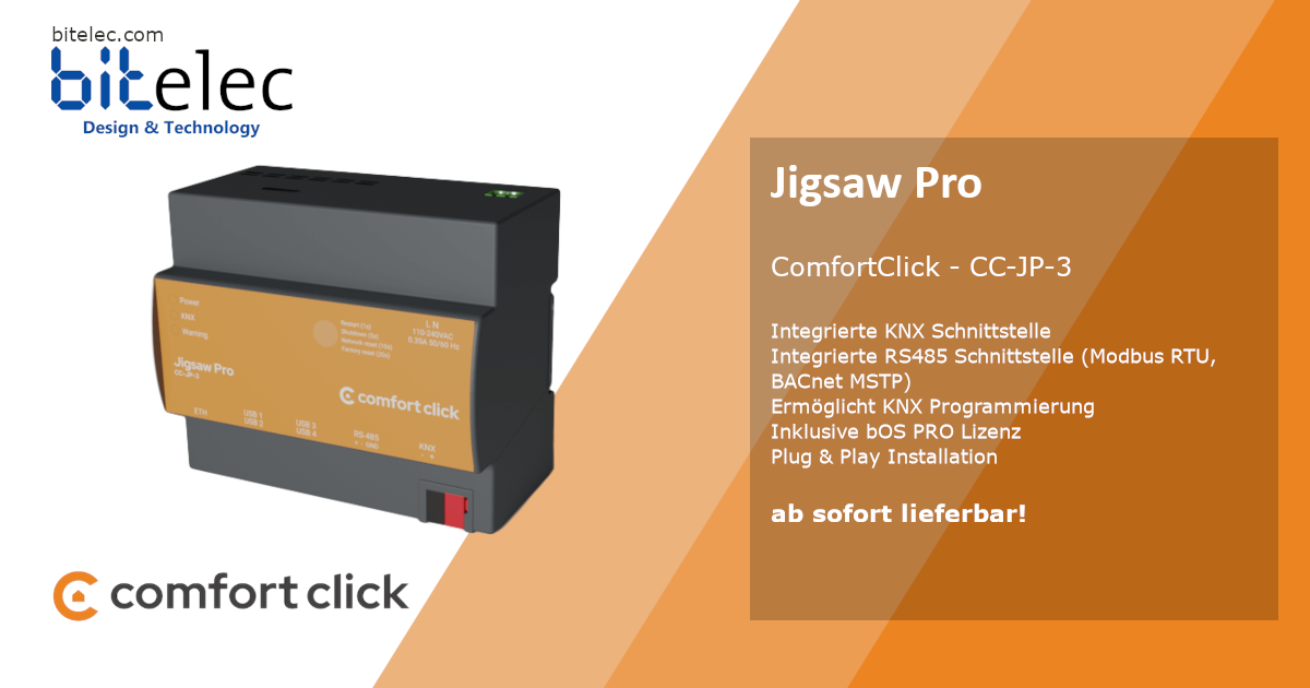 Der neue Jigsaw Pro ist eine Erweiterung der bestehender KNX-Server-Palette von ComfortClick. Die neue Pro Variante verfügt über eine leistungsstärkere Hardware und eignet sich für grössere Wohnobjekte. Der Jigsaw Pro kommt im edlen schwarzen Design daher und verfügt neu über einen Speicher von 4GB. Um den grösseren Projekten gerecht zu werden, ist neu eine bOS Pro Lizenz mit 3 Usern inkludiert. Der Jigsaw Pro hat eine integrierte KNX und RS485 Schnittstelle, die eine direkte Kommunikation mit der KNX Installation und / oder RS-485-Installation (z.B. Modbus RTU, BACnet MSTP) ermöglicht.