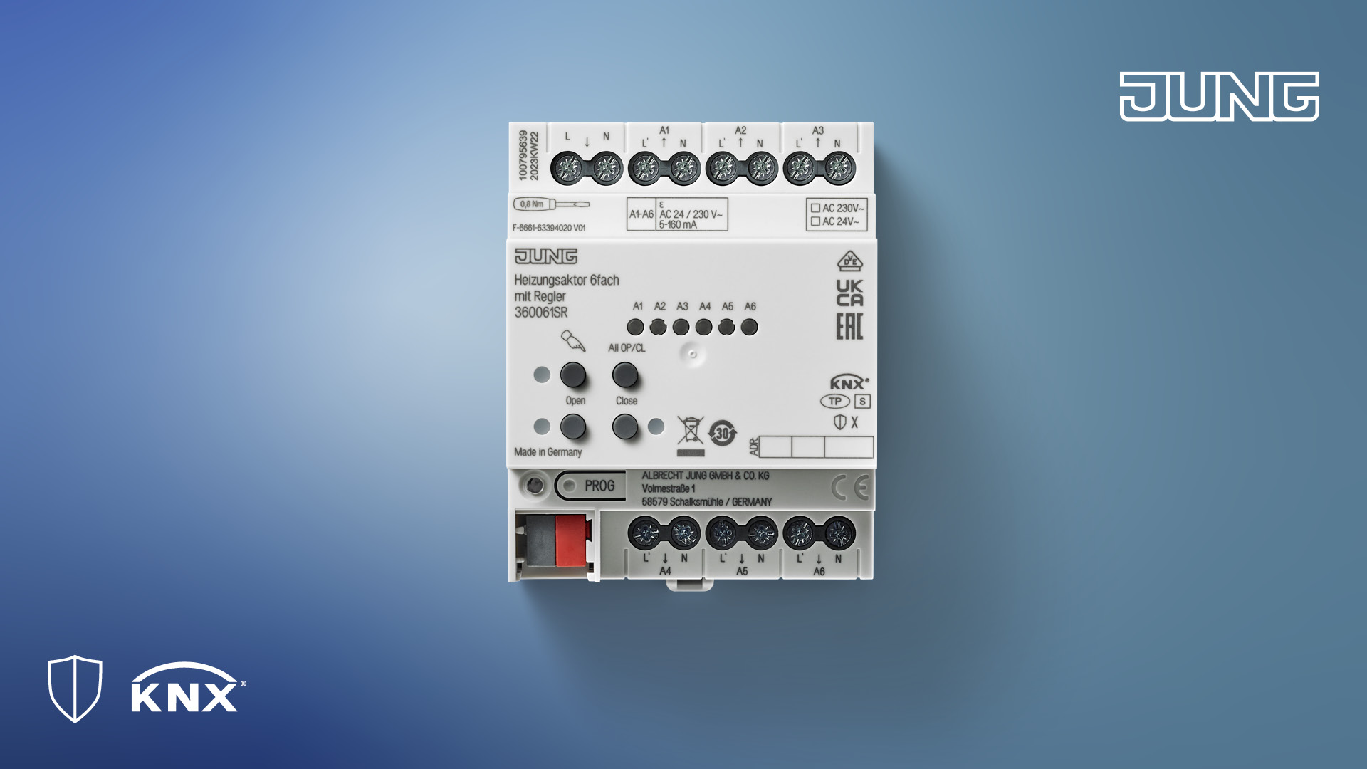 Der neue JUNG KNX Heizungsaktor 6-fach mit KNX Data Secure ermöglicht die zentrale Steuerung von bis zu sechs unabhängigen Heiz- oder Kühlzonen.