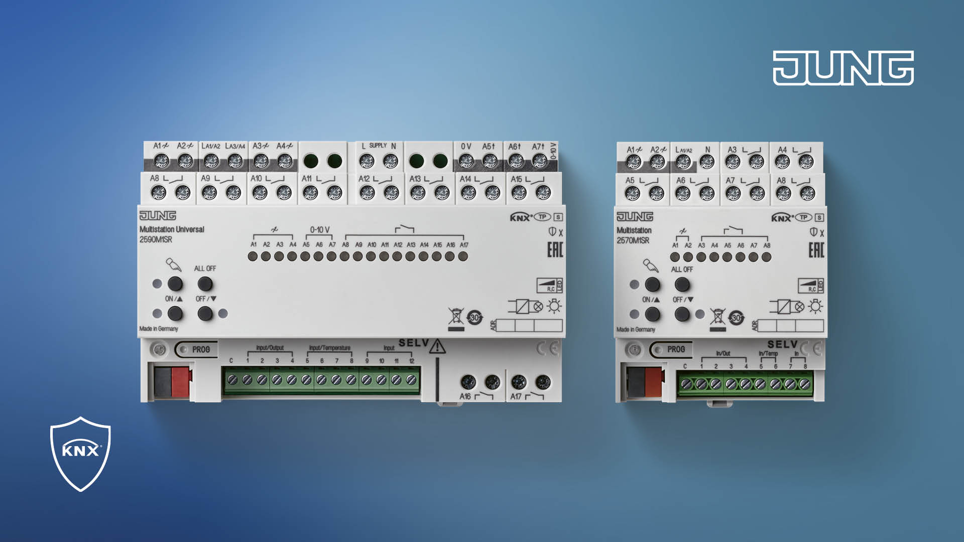 Zwei neue KNX-Multistationen bündeln platzsparend die Funktionen mehrerer Einzelgeräte. Die secure-fähigen Modelle vereinen Schalten, Dimmen, Beschattung und HLK für eine besonders effiziente Projektierung. Ein Handbedienfeld bietet im Servicefall Zugriff auf die Ausgänge. Parametrierung und Updates erfolgen über die ETS.